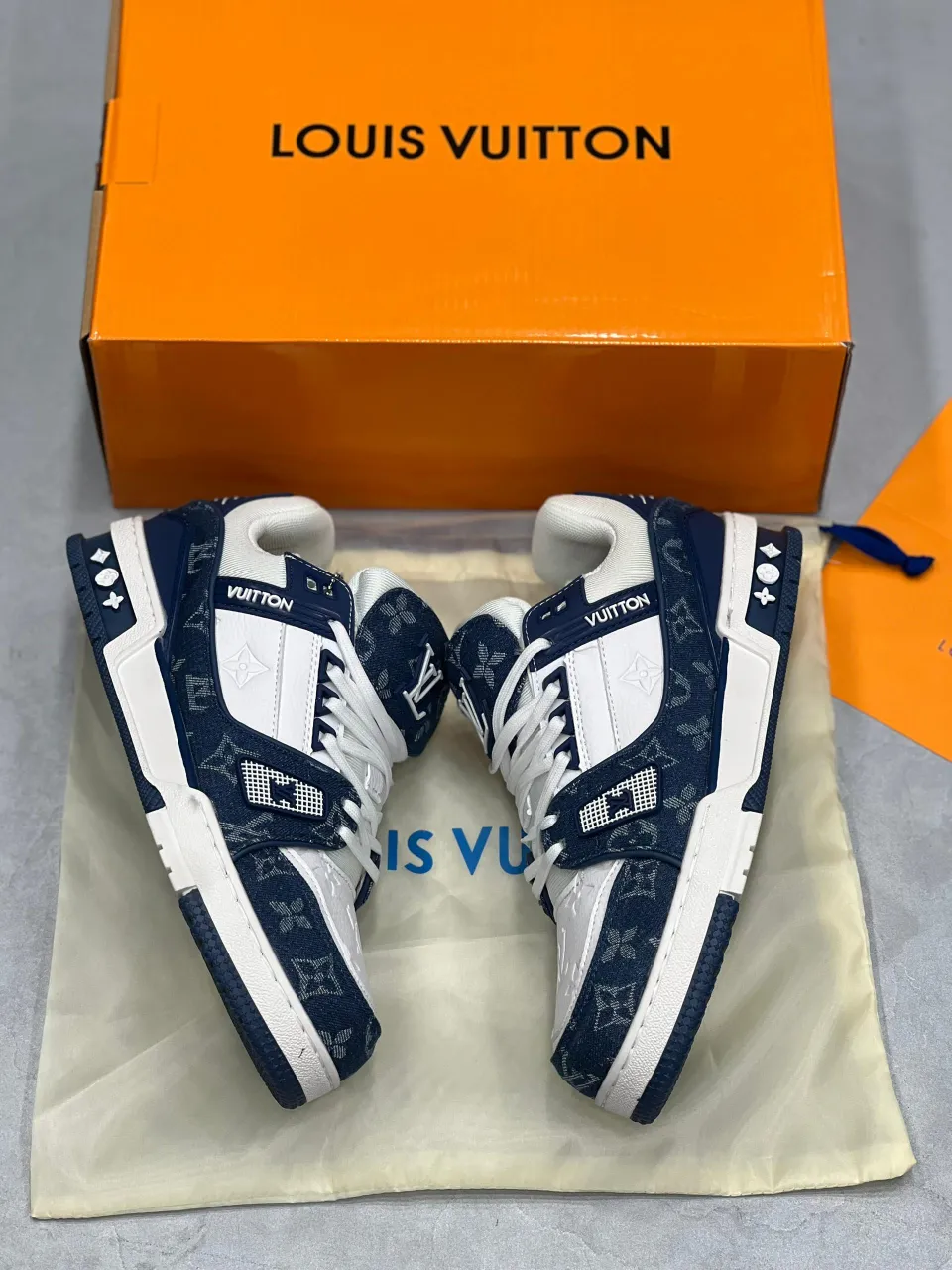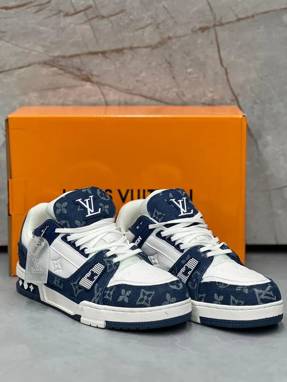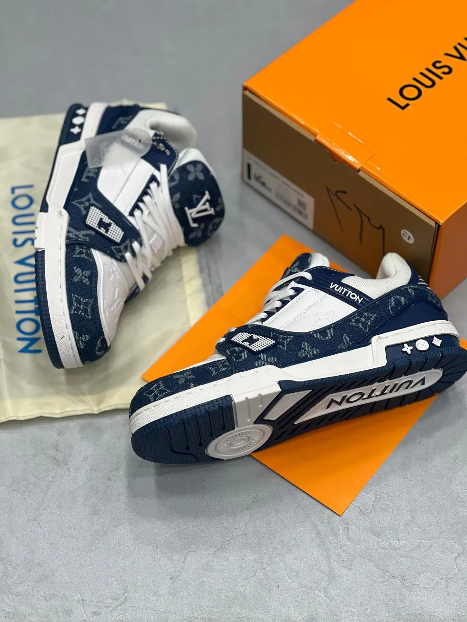 کتونی لویی ویتون مدل ترینر رنگ آبی سفید با بالاترین کیفیت موجود تولید کشور ویتنام
