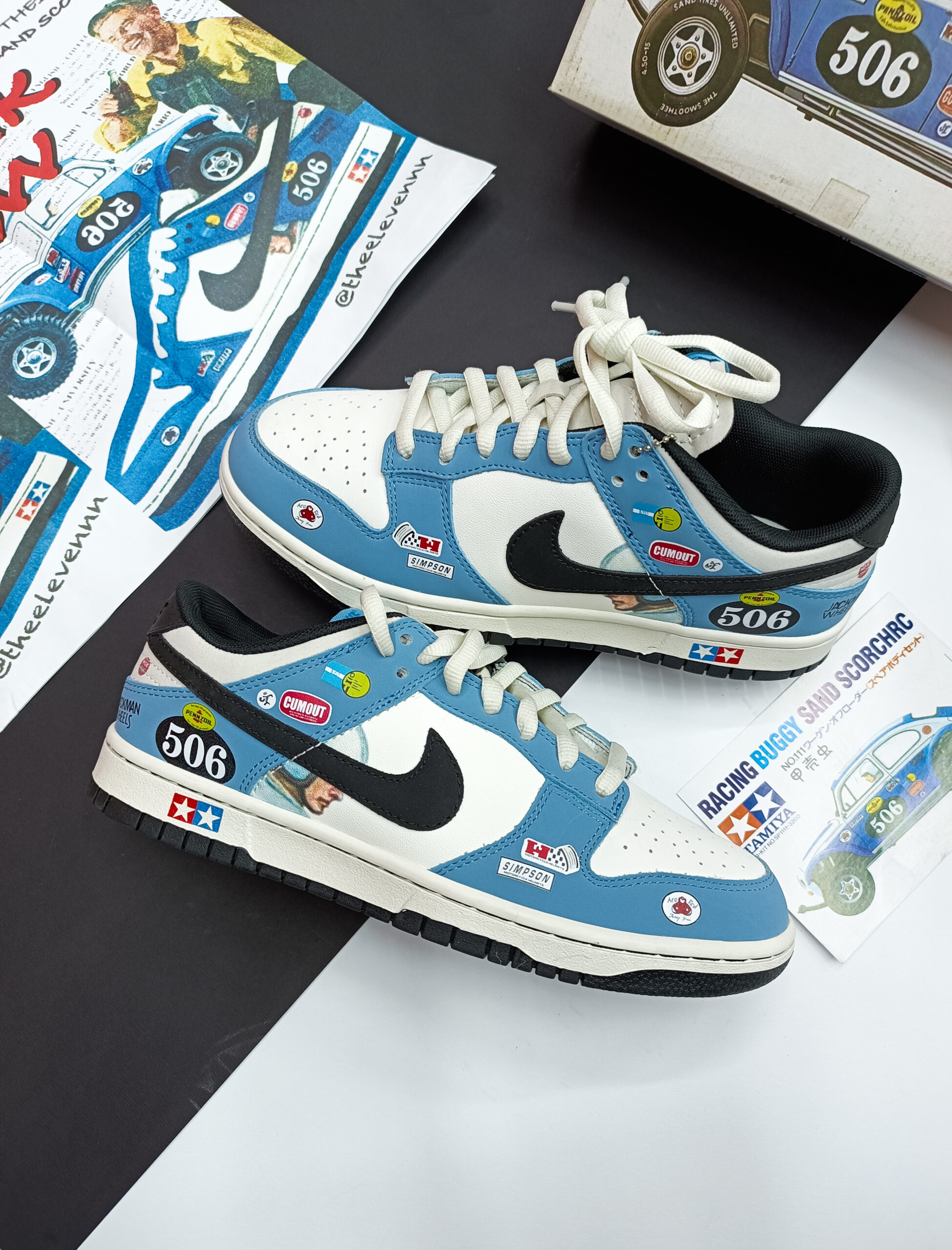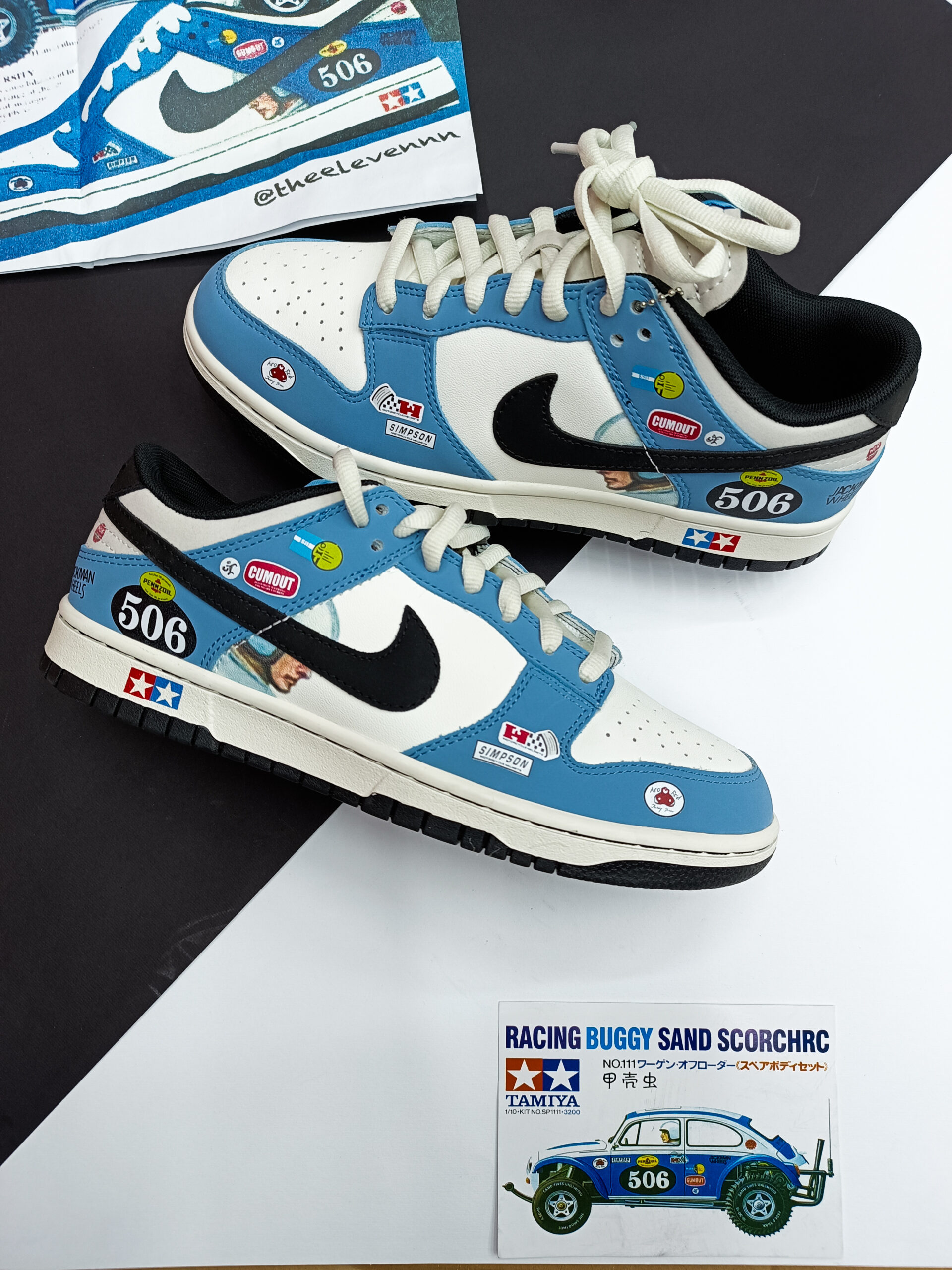 کتونی Nike SB Dunk Low “Racing Buggy Sand Scorcher” با الهام از خودروی کنترلی کلاسیک Tamiya Sand Scorcher طراحی شده است. این مدل با ترکیب رنگهای سفید، آبی و مشکی و جزئیات گرافیکی خاص، ظاهری منحصربهفرد دارد.