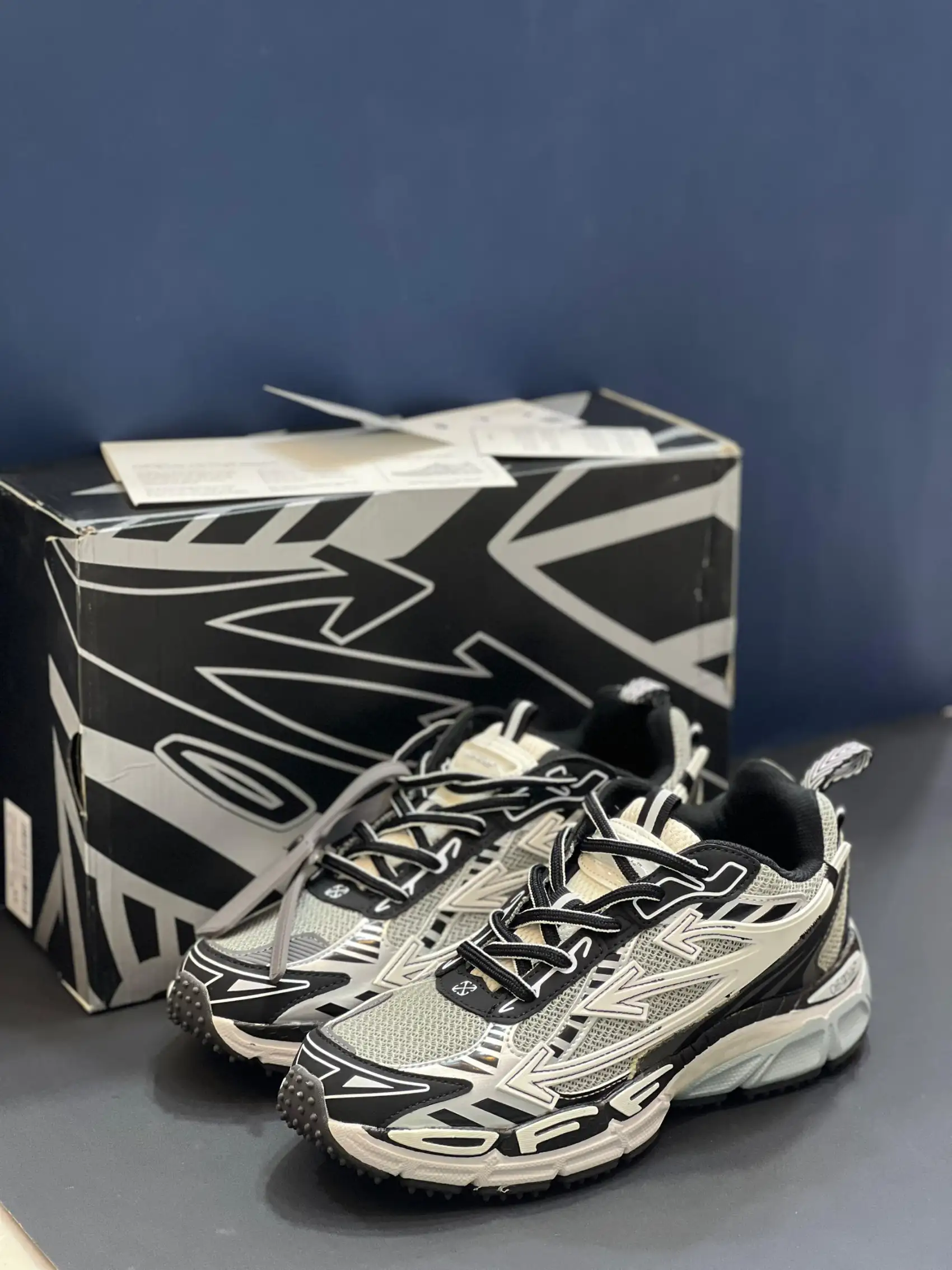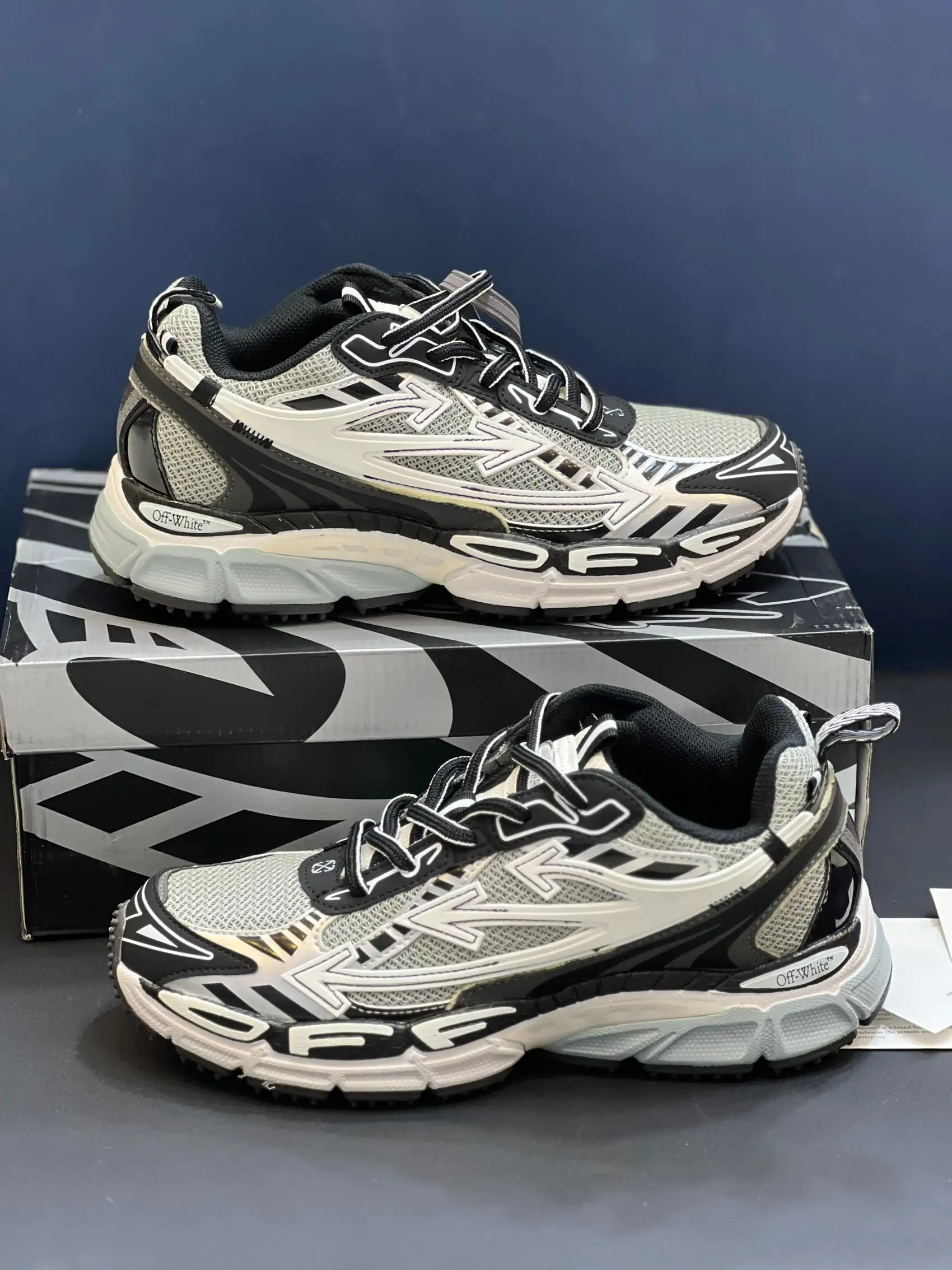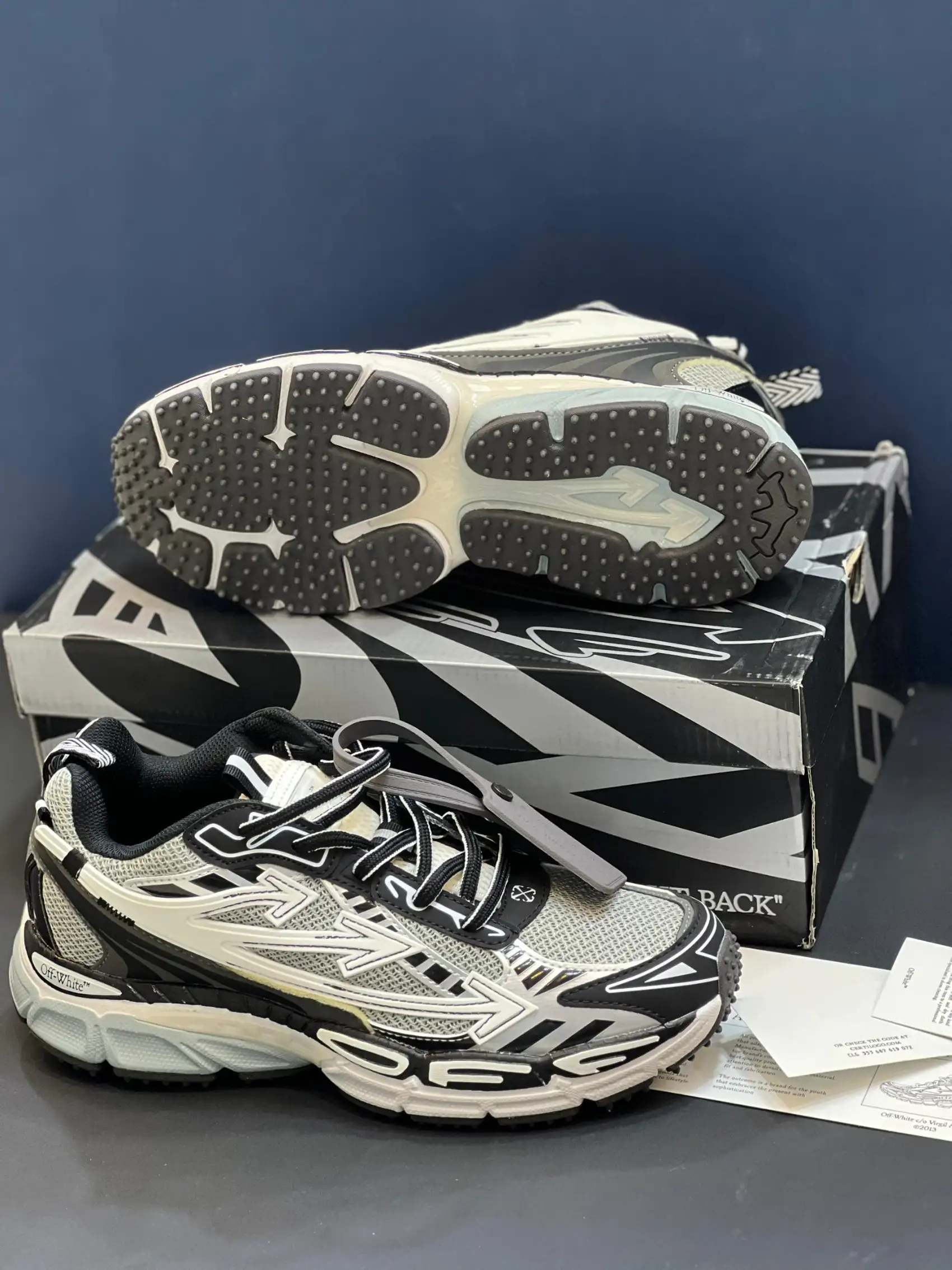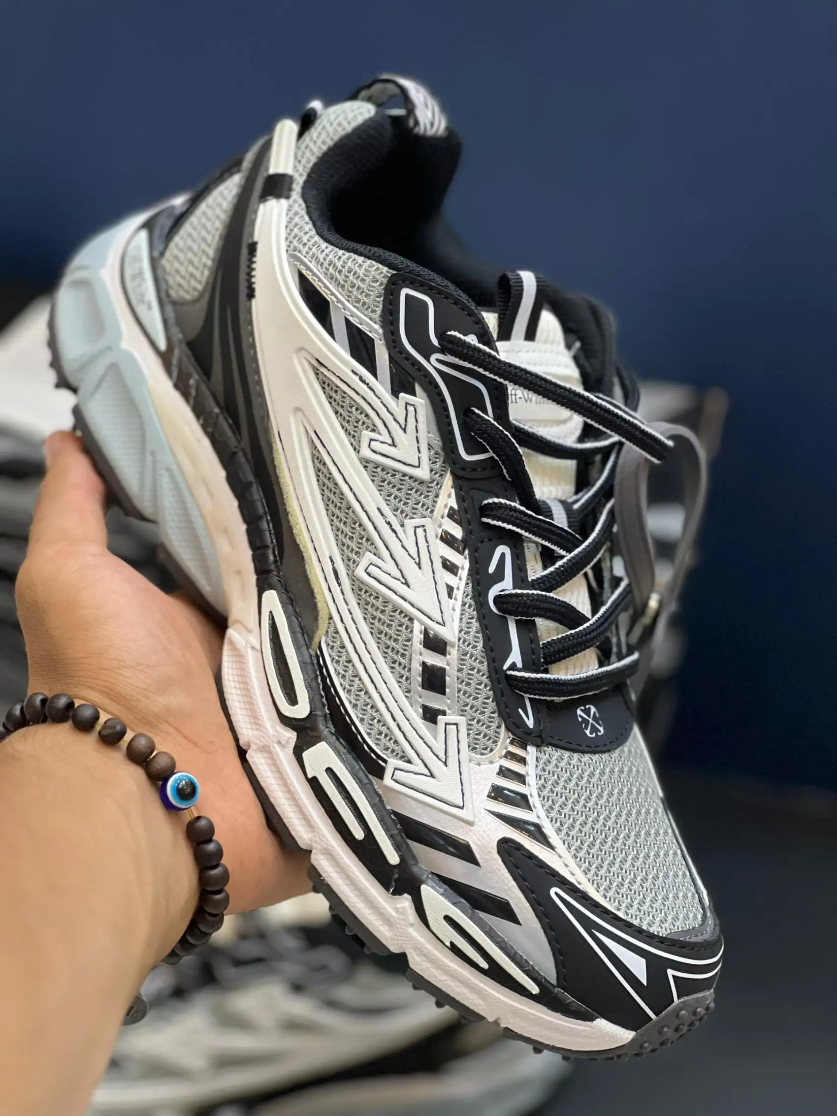 رویه کتونی از مش تنفسپذیر، چرم مصنوعی پتنت و جیر مصنوعی در رنگهای خاکستری روشن، مشکی، سفید و نقرهای ساخته شده که ترکیبی لوکس و بادوام ارائه میده. لوگوی فلشهای معروف Off-White روی کنارهها، زبانه و پاشنه، بهصورت ژلمانند و لاستیکی، هویت برند رو برجسته میکنه. زیپتای نارنجی امضاگونه Off-White روی بندها، جزئیات مینیمال اما چشمگیر اضافه کرده. زیره لاستیکی مشکی با بافت فومی، چسبندگی و راحتی رو تضمین میکنه.