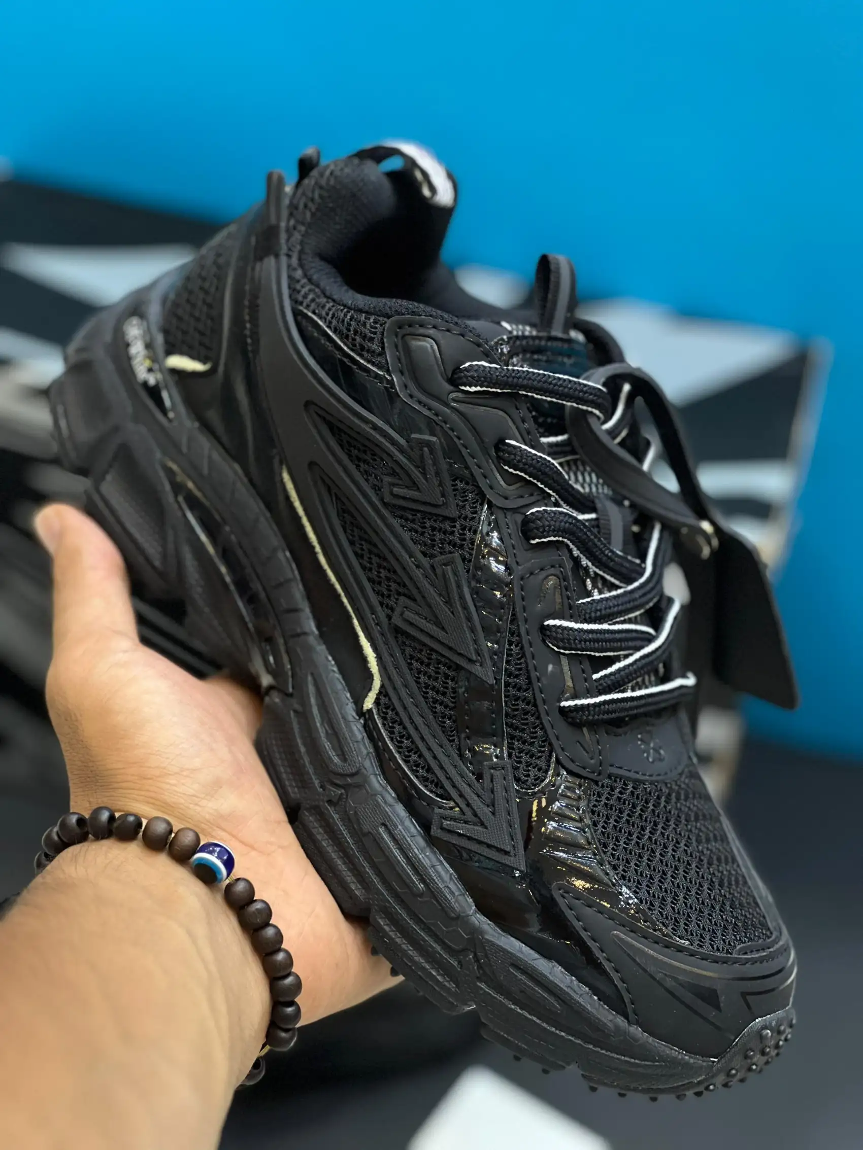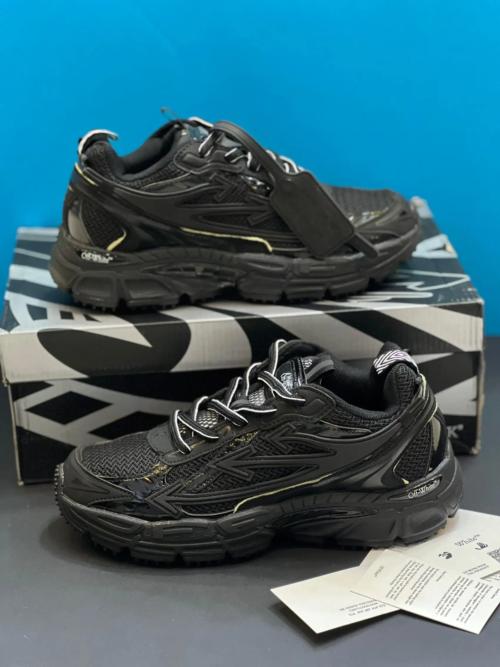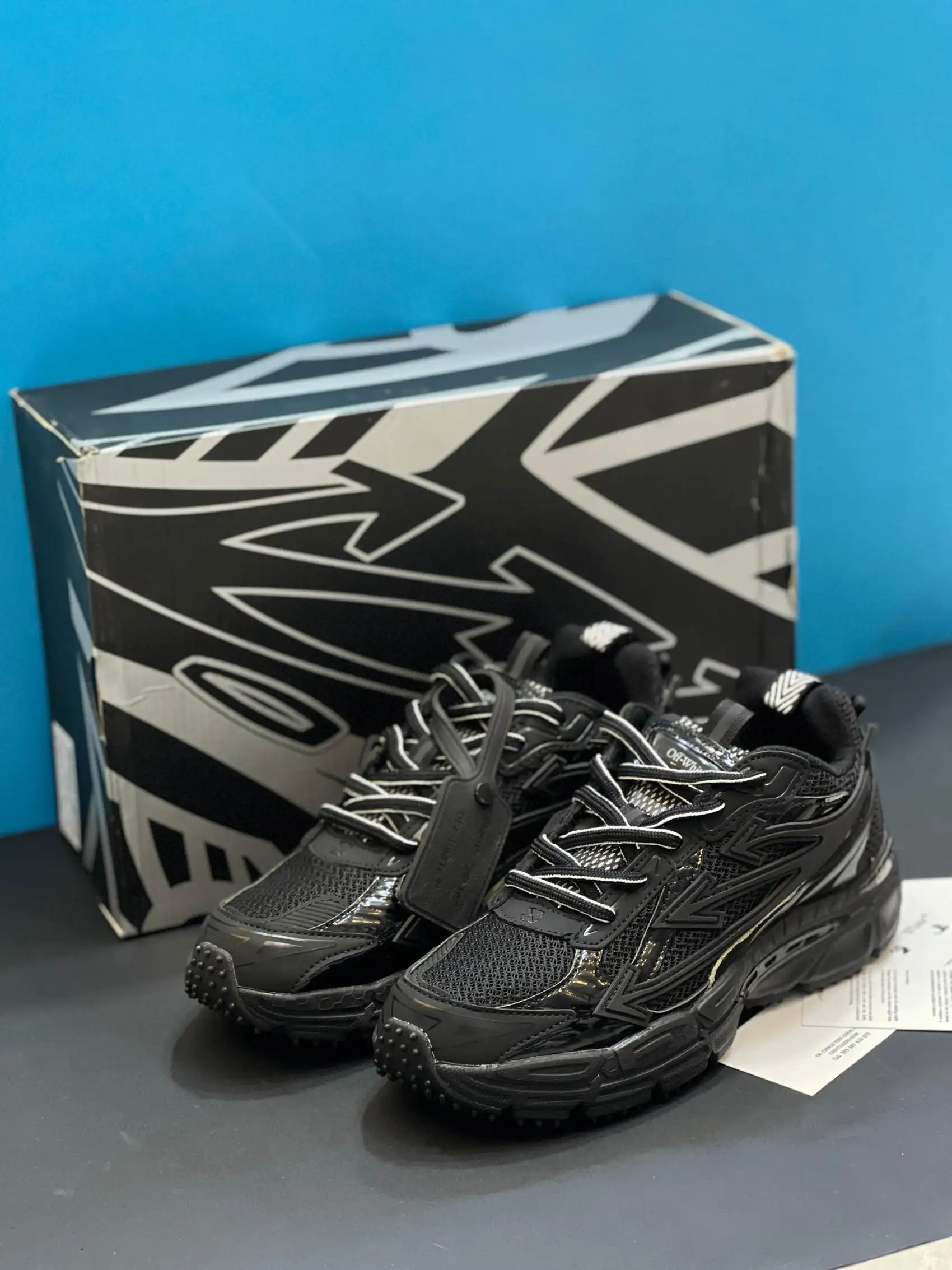 تصور کن یه رویه مشکی از جنس مش تنفسپذیر که انگار با نسیم حرف میزنه، کنار چرم مصنوعی براق و جیر نرم که انگشتاتو نوازش میکنه. فلشهای ژلمانند Off-White، مثل امواج نئونی تو تاریکی، روی کنارهها و پاشنه خودنمایی میکنن. زیپتای سفید، مثل یه فریاد کوچیک تو سکوت مشکی، امضای ویرجیل رو داد میزنه. زیره لاستیکی مواج، انگار از دل یه فیلم علمیتخیلی اومده، هم چسبندگی داره، هم انگار داری رو ابرها راه میری. این مدل با کد OMIA295C99FAB0011001 سال 2023 معرفی شد.