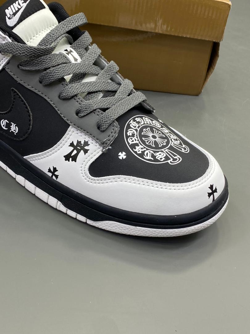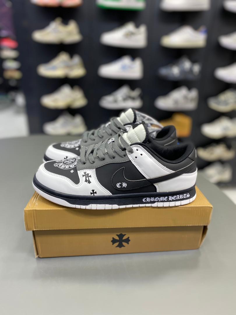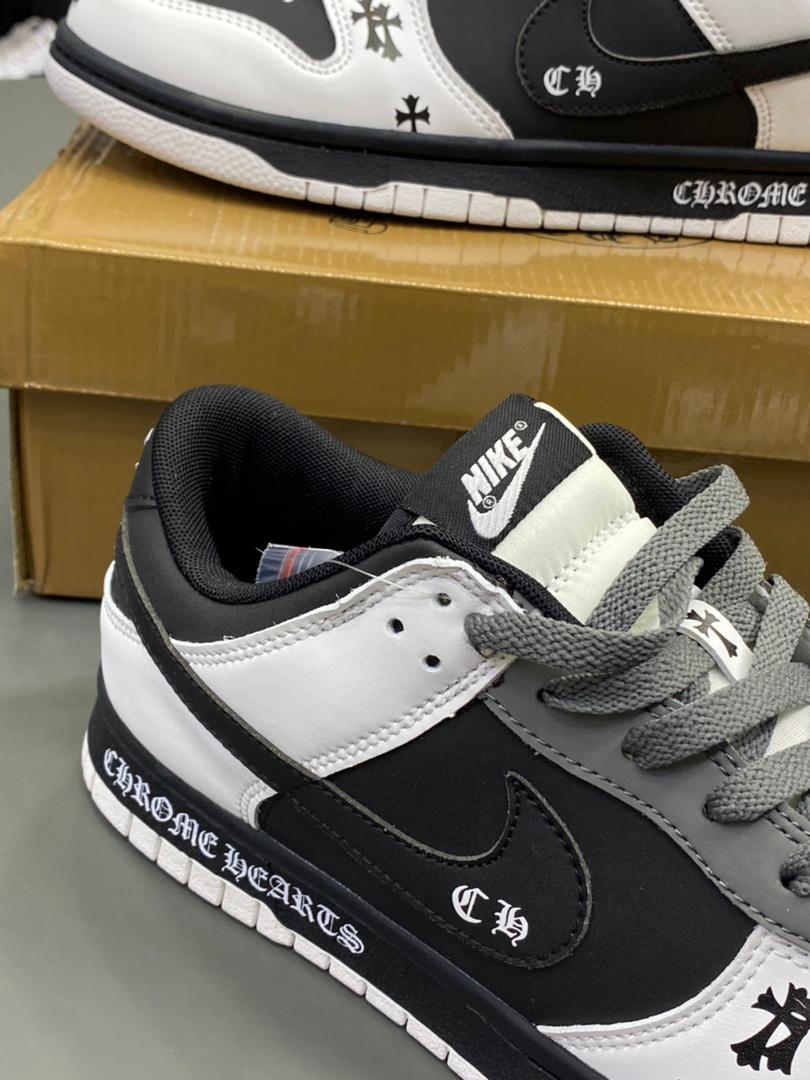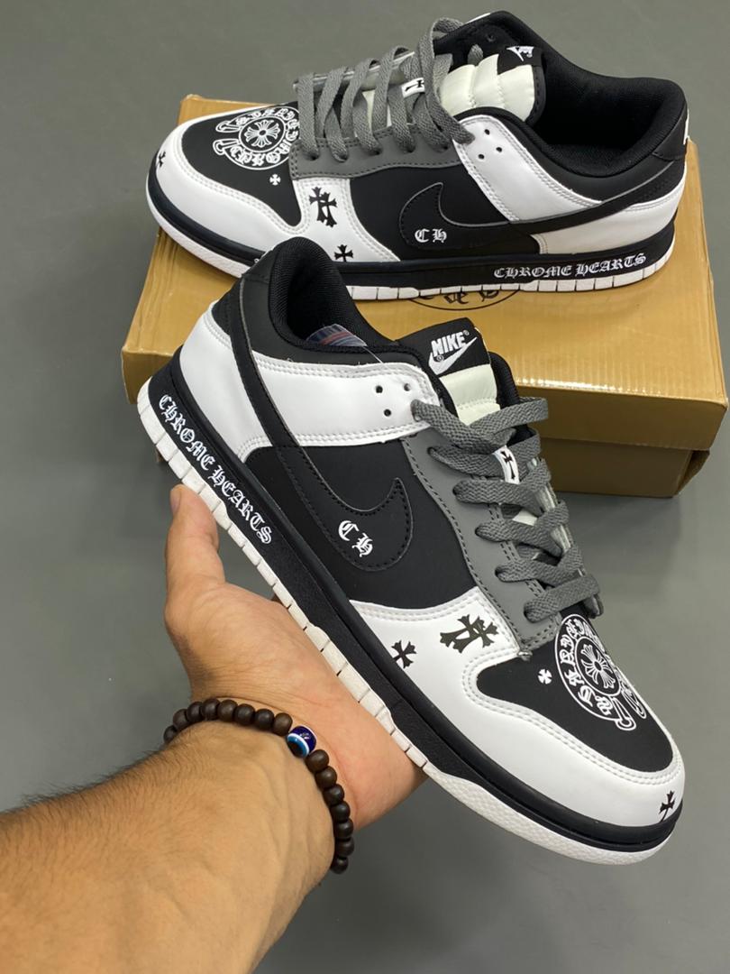 کتونی Nike SB Dunk Low “Chrome Hearts” نتیجهٔ همکاری بین برند نایکی و Chrome Hearts نیست، بلکه سفارشیسازیهایی توسط طراحان مستقل یا مجموعههای خاص بر روی مدلهای موجود نایکی انجام شده است.
