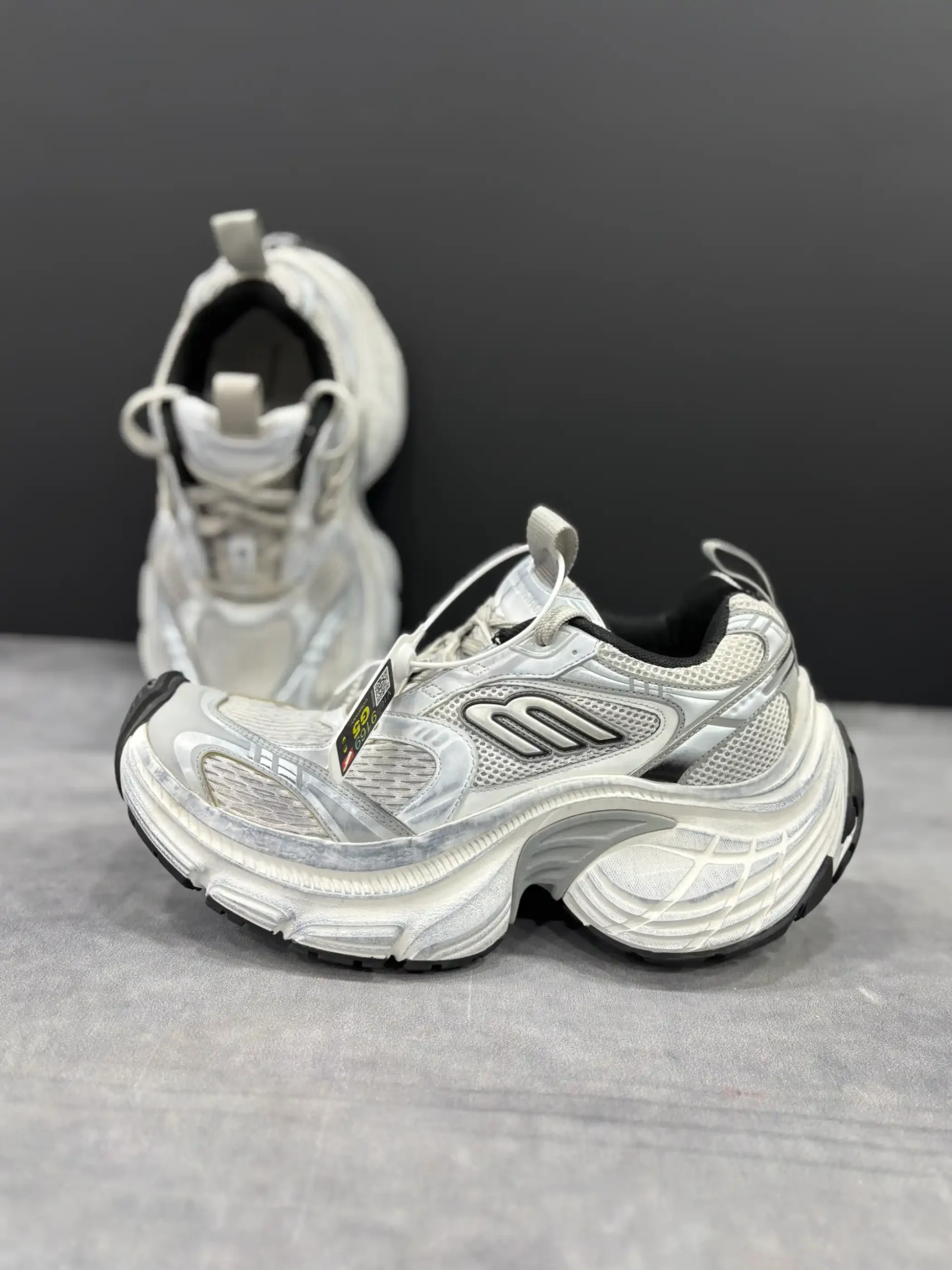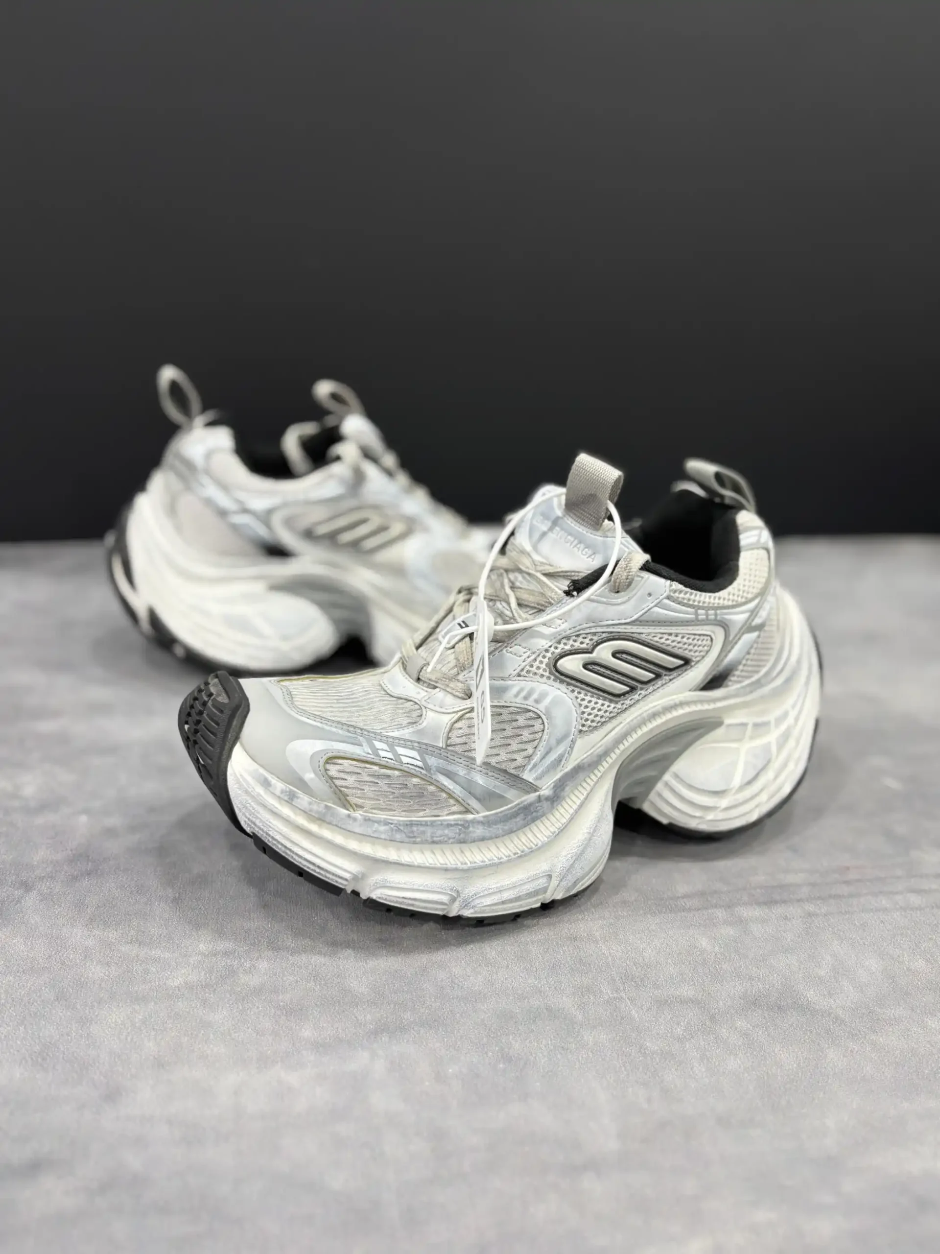 رویه این کتونی از مش تنفسپذیر، TPU و لاستیک ساخته که ظاهری مدرن و مقاوم بهش داده. رنگ سفید با جزئیات خاکستری و مشکی، استایلی خنثی و در عین حال جسورانه ایجاد کرده. اثر فرسودگی عمدی (Worn-out) روی کفش، حس و حال خیابونی و خاص بودن رو تقویت میکنه. لوگوی بالنسیاگا روی زبانه حک شده و آرم 3B در کنارهها، هویت برند رو بهخوبی نشون میده. این کتونی بدون چرم و سازگار با محیطزیست تولید شده.