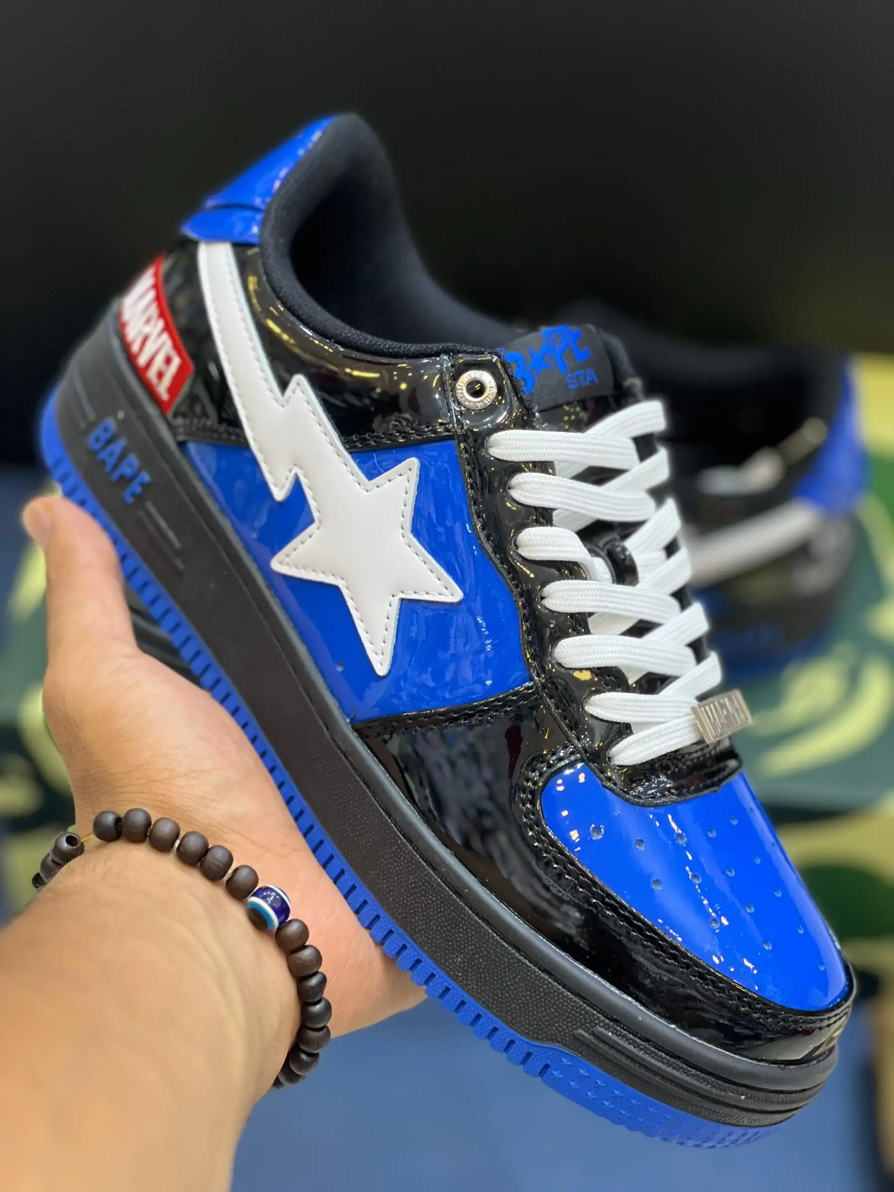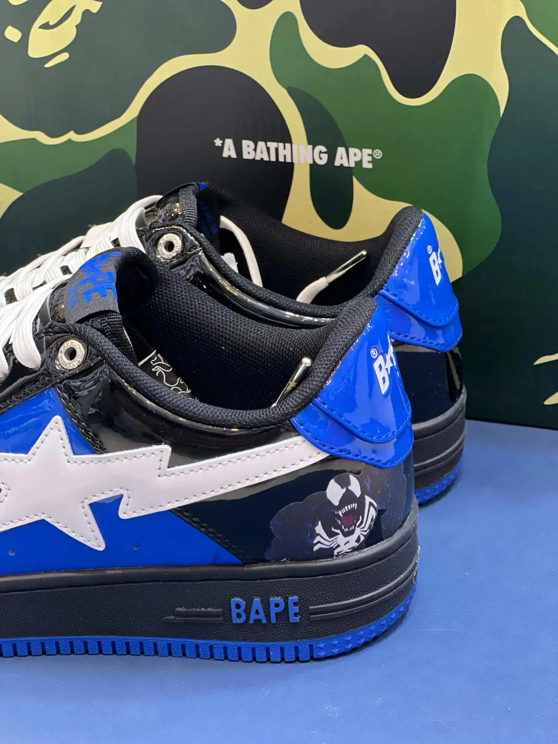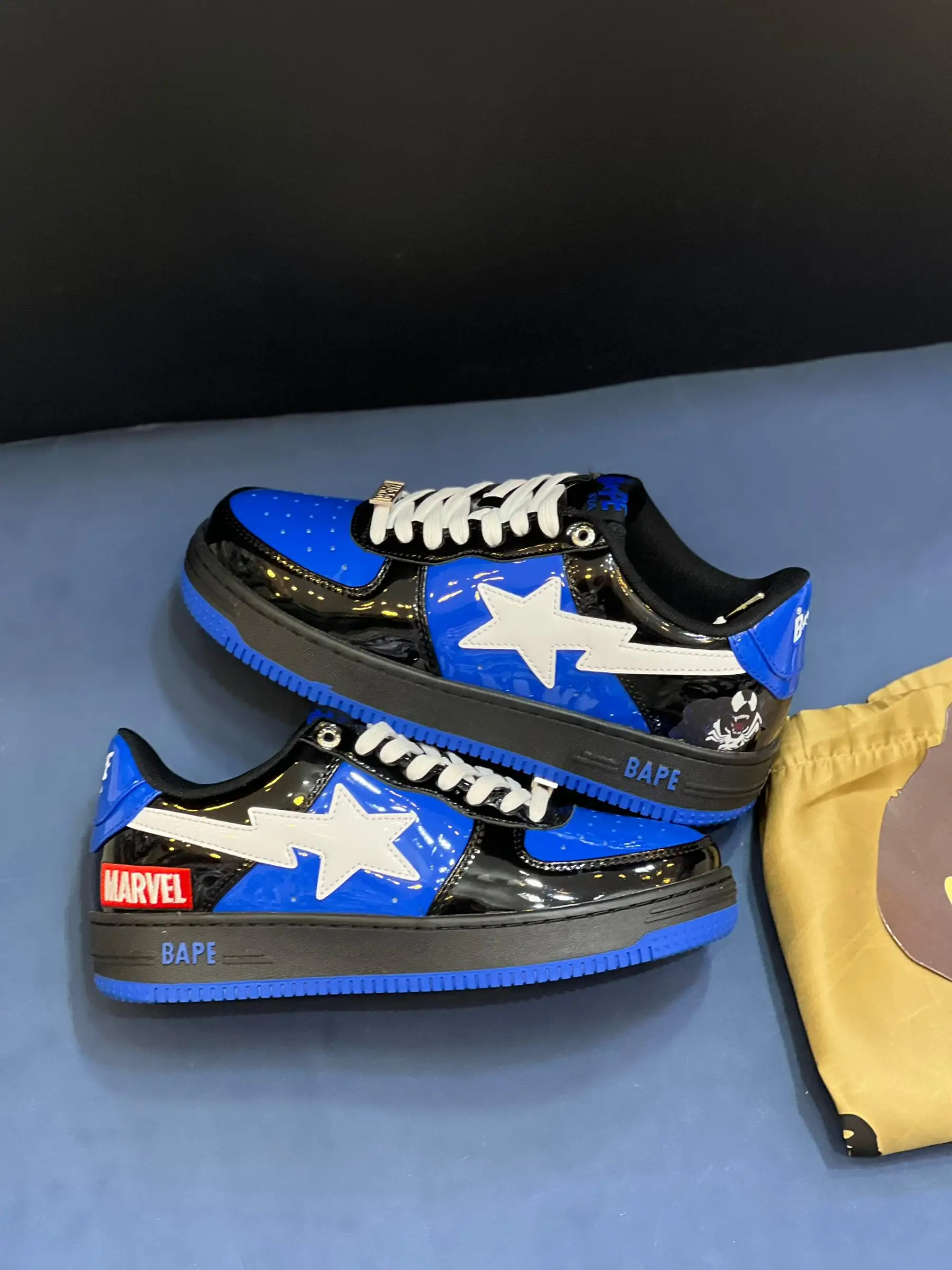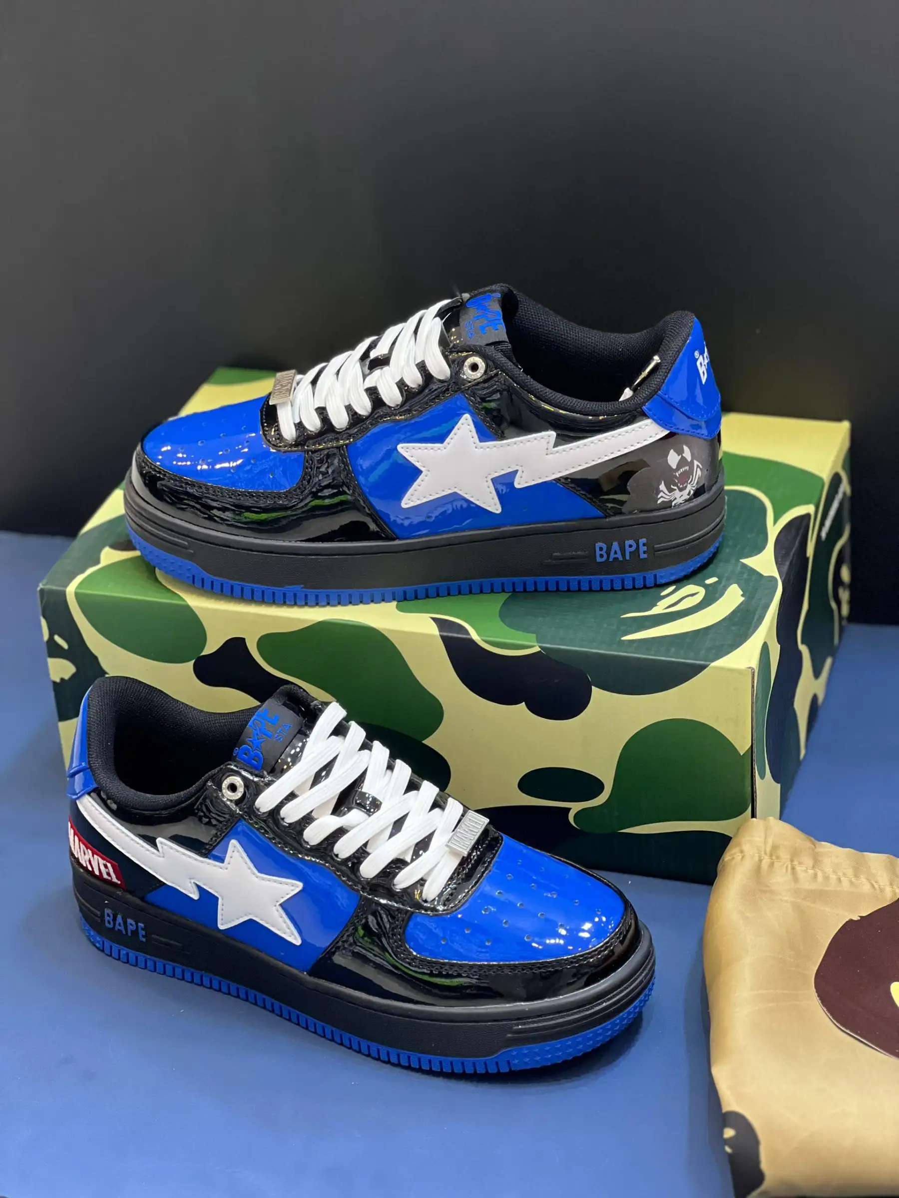 کتونی بیپ مارول ونوم آبی، حاصل همکاری A Bathing Ape و مارول، با الهام از شخصیت ونوم، یه انتخاب خاص برای طرفداران کمیک و استایل خیابونیه. این مدل با رنگ آبی و مشکی، هویتی جسورانه داره.