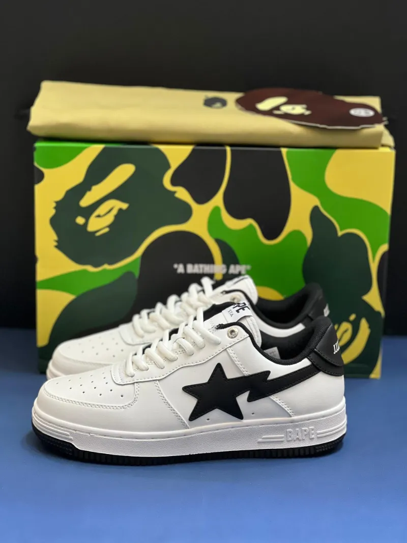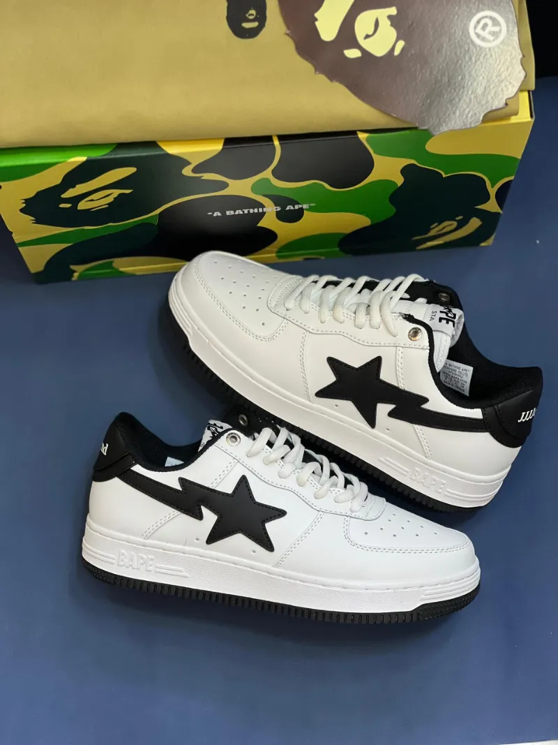 رویه کتونی بیپ از چرم سفید باکیفیت ساخته شده که با روکشهای نوی روی لوگوی ستارهای (Bapesta Star) در کنارهها، زبانه و پاشنه تزئین شده. طراحی ساده و شیک با تمرکز روی جزئیات مینیمال، هویت مشترک Bape و JJJJound رو به نمایش میذاره. زیره میانی با فوم نرم، راحتی خوبی داره و زیره خارجی لاستیکی نوی، چسبندگی و دوام ارائه میده. جعبه خاص با طرح کامو آبی و لوگوی طلایی JJJJound، این مدل رو به یه اثر کلکسیونی تبدیل کرده.