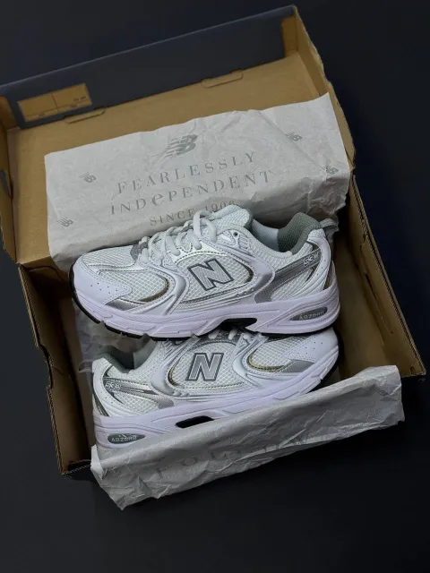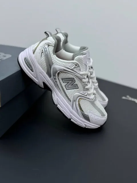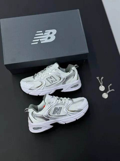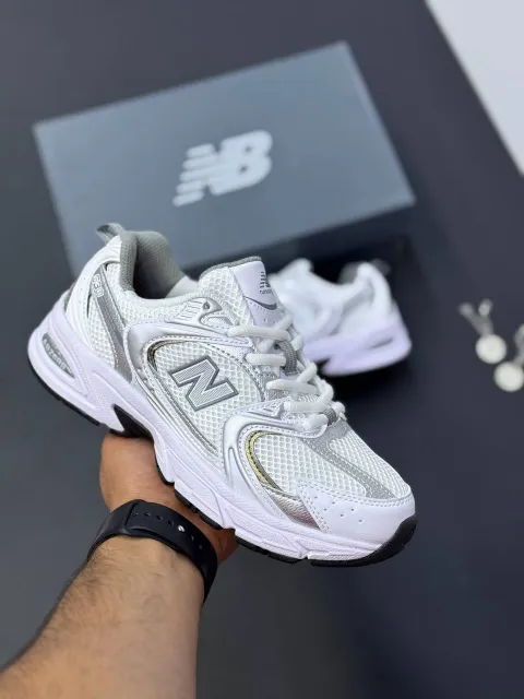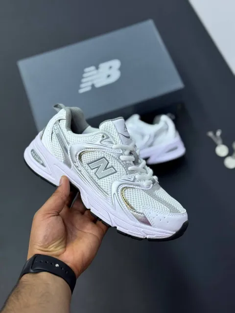کتونی نیوبالانس 530 سفید نقرهای با کفی نرم و راحت و وزن بسیار سبک مناسب استفاده طولانی مدت و پیاده روی ساخت کشور ویتنام
