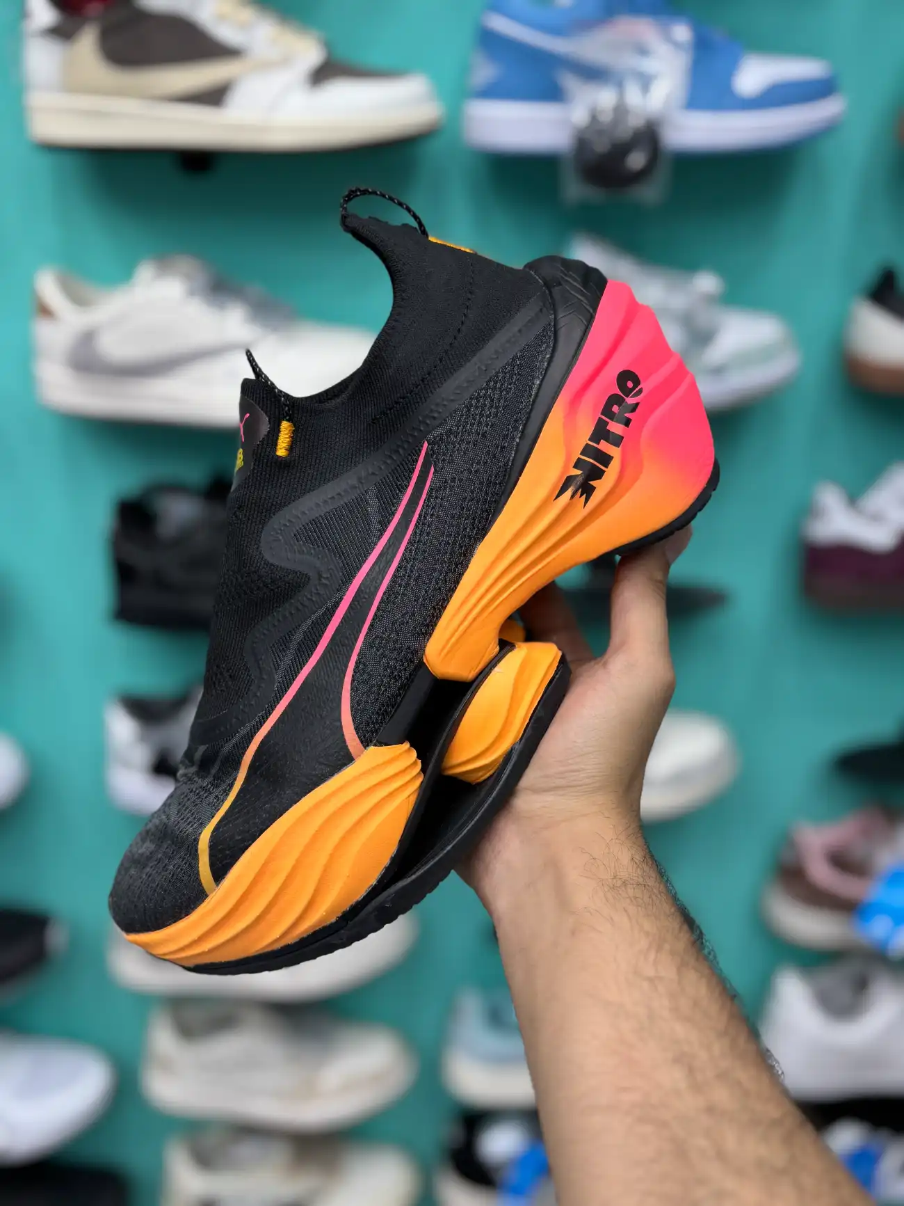 رویه این کتونی از مش بدون بند (Laceless Mesh) ساخته شده که با PWRTAPE تقویت شده تا فیت محکمی بده. رنگ اصلی مشکی (Black) با الگوهای آفتابی (Sun Stream) و کفی نارنجی آتشین (Fireglow) ترکیب شده که حس کنتراست و انرژی رو منتقل میکنه. زیره میانی با 58 میلیمتر ارتفاع، از فوم پیشرفته NITROFOAM™ Elite استفاده میکنه که یه ضربهگیری فوقالعاده و بازگشت انرژی داره. سه صفحه PWRPLATE (شامل یک صفحه کربنی کامل و دو صفحه TPU) تو زیره، نیروی پیشران رو به حداکثر میرسونن. زیره خارجی با PUMAGRIP، چسبندگی عالی تو سطوح مختلف داره.